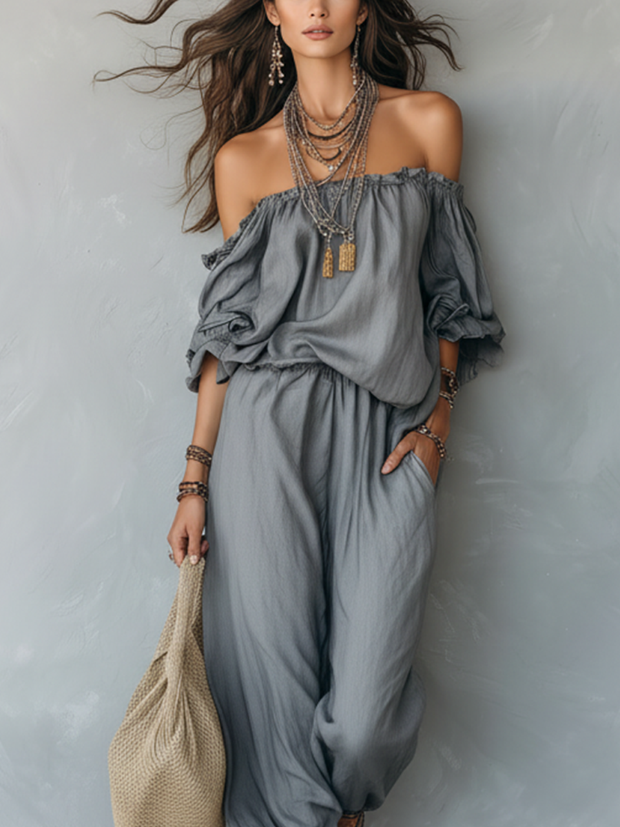 Whether dressing up for a special occasion or enjoying a casual day out, the Bohemian-style Draped Gray Jumpsuit is an exquisite choice. Its elegant design and versatile nature make it a standout piece, offering endless styling opportunities.