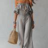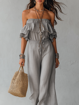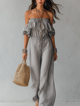 Bohemian style Gray Off the shoulder Wide leg Jumpsuit With Ruffled Details
