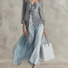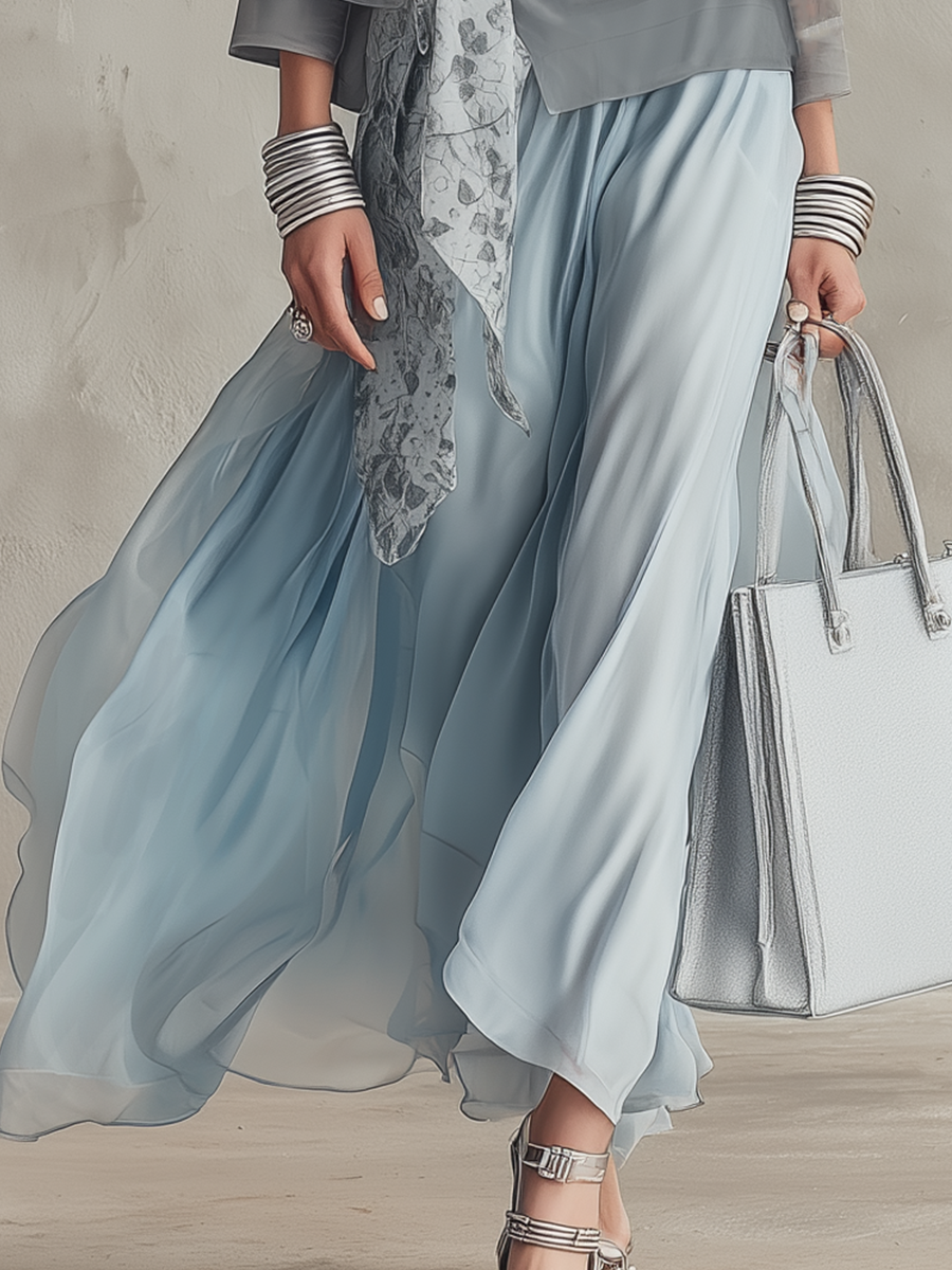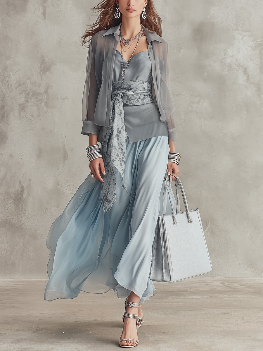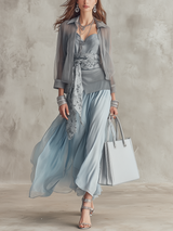 Pair this elegant set with nude heels and minimalistic jewelry for a sophisticated look. Envelop yourself in the lightweight sheer fabric during warm evenings, and consider adding a stylish clutch to complete the outfit.