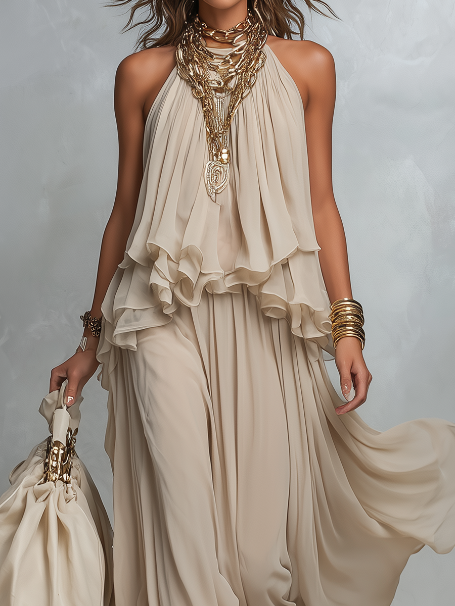 This exquisite Ethereal Layered Halter Bohemian Set captures the essence of timeless elegance and free-spirited style. The set is crafted from lightweight, breathable fabric that drapes beautifully, providing both comfort and grace. Its intricate detailing and layered design create a captivating visual aesthetic that is perfect for various occasions.