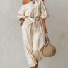 The Off-the-shoulder Linen Jumpsuit with Tie Straps is perfect for those who seek comfort without compromising on style. Its versatile design makes it suitable for a casual day out or an evening gathering, making it a must-have piece for any fashion-forward individual.