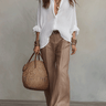 - Wide-Leg Trousers: These trousers are designed with a warm sand brown hue, providing a relaxed yet chic look.