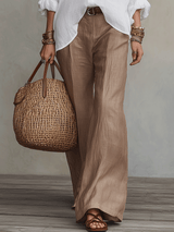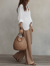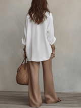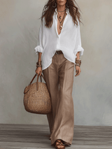 Soft Casual White Lightweight Linen Shirt Warm Sand Brown Wide-Leg Trousers