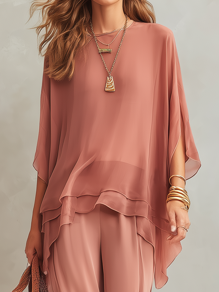 The Airy Layered Chiffon Top & Pants Set is a must-have for those seeking a blend of elegance and comfort. With its graceful design and versatile nature, it makes a fabulous choice for any occasion.