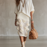 This exquisite two-piece set features an artisan ivory textured knit top paired with a beautifully designed floral appliqué skirt. Each element of this ensemble is crafted with attention to detail and natural elegance.
