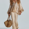 The "Atmospheric Gold Sequined Cover-up And Matching Set" is an epitome of elegance and modern glamour. Whether you're attending a sophisticated event or simply wish to make an impression, this set provides the perfect balance of style and opulence.