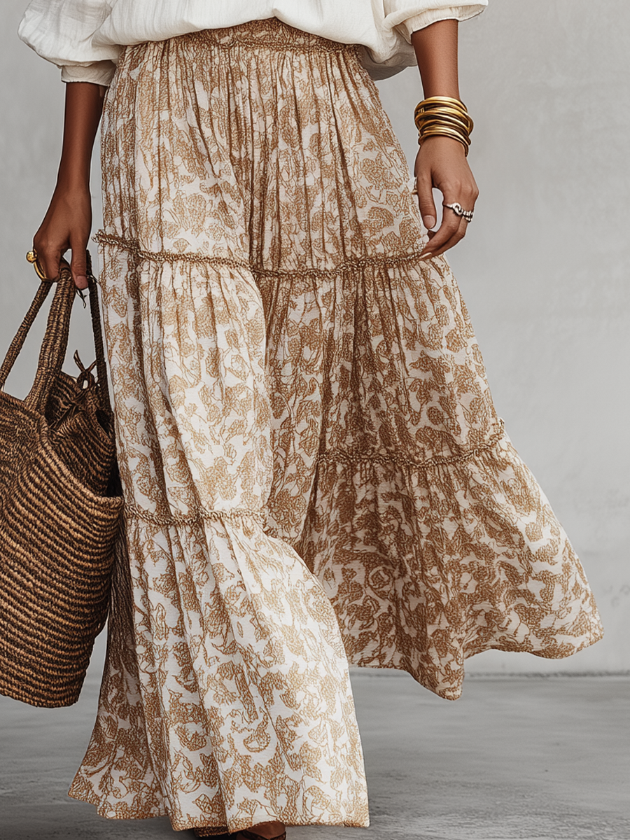 • Skirt design: Maxi length with a flowing A-line or tiered panels for natural movement and an elongated profile.