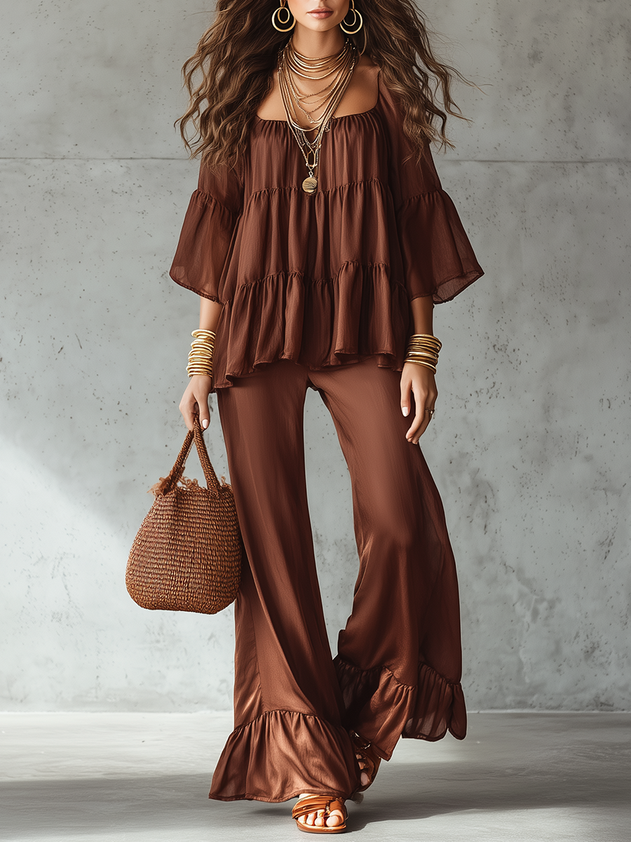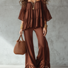 Bohemian Espresso Tiered Ruffle Off-the-Shoulder Top & Wide-Leg Trouser Co-ord Set