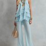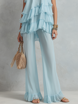 Bohemian Style Light Blue Halter Neck Ruffle Top And Wide Leg Pants Set