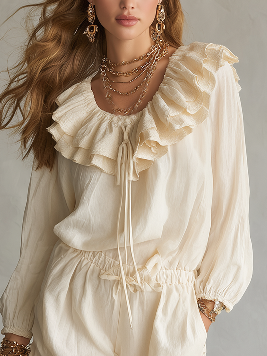 Boho Cream Ruffled Blouse Drawstring Shorts Set