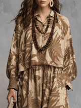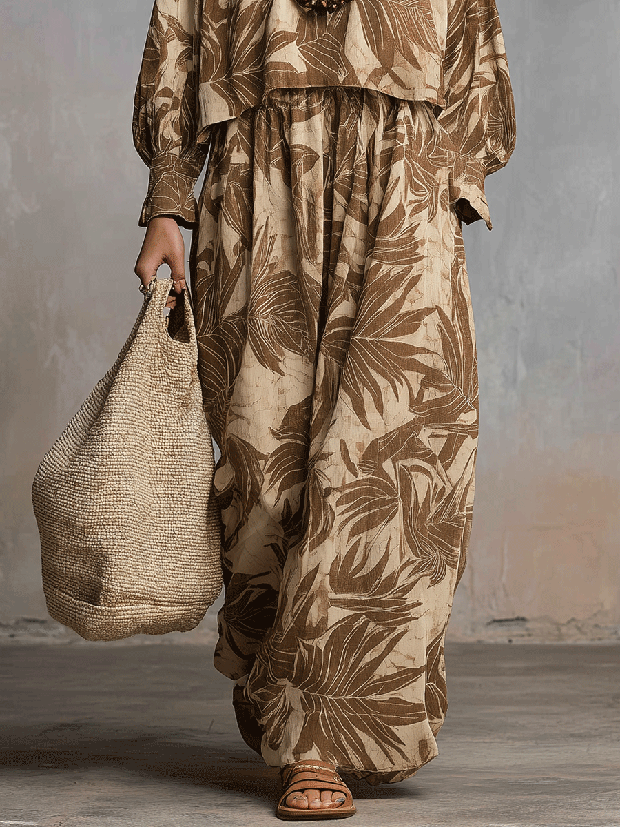 Embrace your inner bohemian spirit with our Earthy Leaf Print Bohemian Lounge Set. This stunning ensemble is designed for comfort and style, featuring a captivating leaf print that captures the essence of nature's beauty. Perfect for both relaxing at home or stepping out for a laid-back outing, this lounge set is a must-have for any wardrobe.