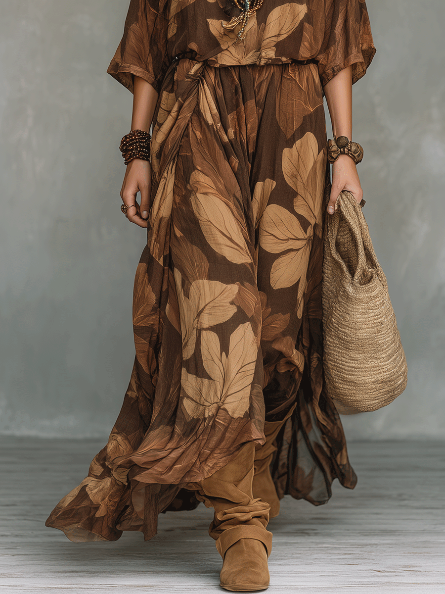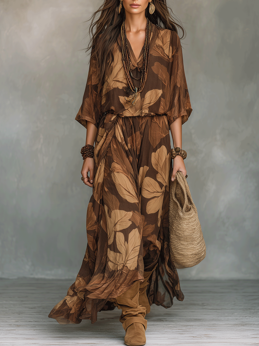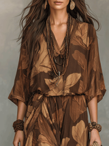 Earthy Leaf Print Relaxed Bohemian Maxi Set