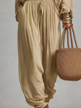 This elegant co-ord set features an off-the-shoulder top with a graceful draped design, paired with stylish harem trousers in a sophisticated dune beige color. Crafted for comfort and style, this set easily transitions from day to night.
